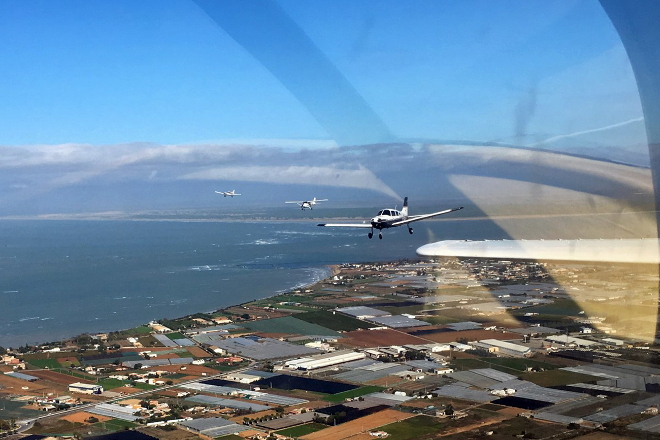 Tras el despegue del aeropuerto Sevillano y reunión en el punto designado, la formación, en contacto con la torre de la base aeronaval, alcanzaron la línea de costa a la altura de Chipiona, virando hacia el sur, hacia la bahía de Cádiz, donde se encontraron con el navío.