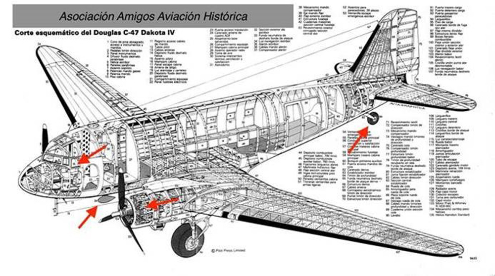 - Motor izquierdo P&W R-1830 completo (motor, hélice, bancada y capós). No es necesario que funcione.